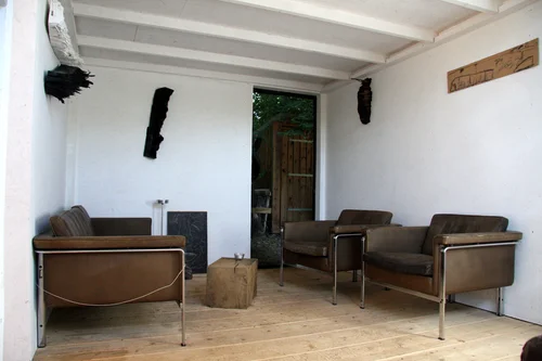 Zwei tief ins Gebäude reichende Öffnungen prägen die Struktur des zweigeschossigen Gebäudes. Sie markieren kommunikative Freibereiche, der eine lässt von Süden die Natur tief ins Innere des Gebäudes drängen, der andere öffnet sich nach Westen und ist intimer.